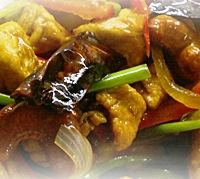 Forberedelse Kyllingekød skæres ud i kuber på ca. 3 x 3 x 3 cm. og drysses med melet så alle stykker er let dækket Snackpeber skæres i tynde strimler på ca. 5-6 cm. Vårløgenes grønne del skæres i strimler på ca. 5-6 cm. Løget skæres i tynde både Chilier skæres i ca. 5 cm. lange rør Hvidløgene knuses og hakkes groft. Bland alle ingredienser til saucen i en skål. (Fiskesovs, sød soyasovs, østerssovs, sukker og vand/bullion) |