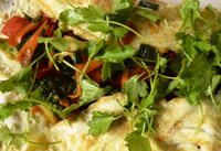 Tilberedning Bland alle ingredienser i en skål og rør godt rundt i massen Varm en pande op med olien til den ryger Hæld æggemassen ud så den dækker hele panden Skru ned for varmen og lad omeletten bage i ca. 5 min Vend omeletten og bag den yderligere 5 min. |