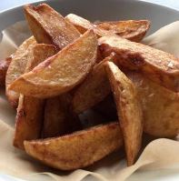 Kartoflerne skæres til pomfritter. Hvis du har tid, kan lægge de udskårne fritter i vand natten over for at trække stivelsen ud |